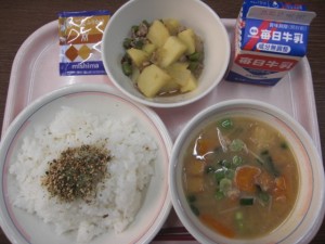 今日の給食は、牛乳・ごはん・ごまふりかけ・豚肉とじゃがいもの煮物・厚揚げのみそ汁 でした。