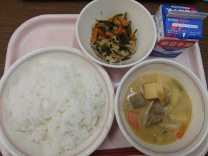 今日のメニューは、牛乳・ごはん・みそおでん・茎わかめの炒め物 でした。