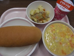 今日の給食は、飲むヨーグルト・コッペパン・ジャーマンポテト・コーンスープ でした。