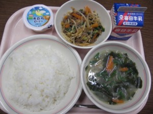 今日の給食は、牛乳・ごはん・ビビンバの具・わかめスープ・すだち(=巣立ち)ゼリー でした。(リクエスト献立 ごはんの部第1位です。)