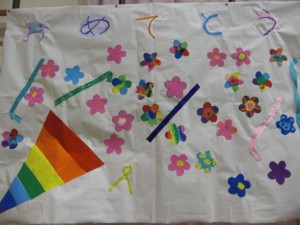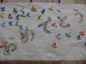【3年】「おめでとう」の文字も、一つひとつが羽ばたく鳥です。