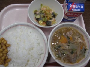 今日の給食は、牛乳・ごはん・かた豆・鮭とキャベツの塩こうじ焼き・豚汁 でした。