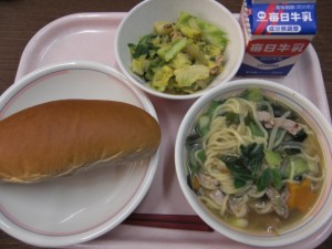 今日の給食は、牛乳・減量黒糖パン・しょうゆラーメン・鶏キムチ炒め でした。
