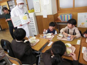 一緒に給食を食べます。栄養士さんのわかりやすい解説つきです。