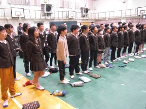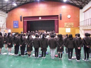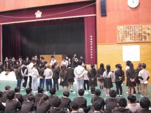 卒業式に先立って、全学年が体育館に集まって六年生の卒業を祝いました。