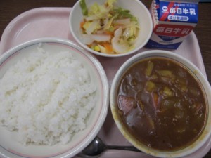 今日の給食は、牛乳・ごはん・ポークカレーライスの具・大根サラダ でした。