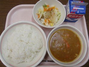 今日の給食は、牛乳・ごはん・チキンカレーライスの具・ゆうすげ村の大根サラダ でした。