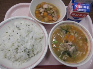 今日の給食は、牛乳・菜めし・春野菜の煮物・豚汁 でした。