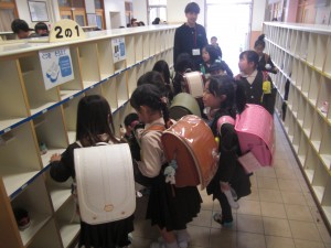 車に気を付けて帰るように、玄関でも先生が指導してくれています。