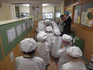 給食当番が並んで、給食室に給食を取りに行きます。エプロンがピカピカです。