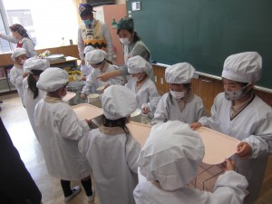 給食当番が配膳します。今日はたくさんの先生がヘルプに来てくださいました。