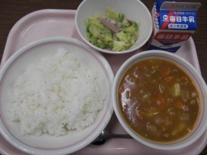 今日の給食は、牛乳・ごはん・チキンカレーライスの具・ハムとキャベツのソテー でした。
