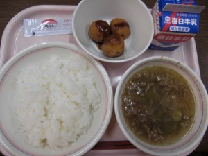 今日の給食は、牛乳・ごはん・大阪府産のりの佃煮・揚げたこ焼き・肉吸い でした(日本全国味めぐり①大阪編です)。