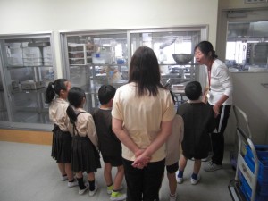 「ここが給食室です。大きなお鍋がみえるでしょう?」