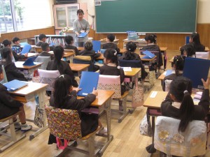 1年生は、教室でしっかり先生の話を聞いて、学校の過ごし方について勉強していました。