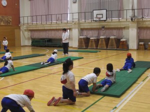 2年の体育は、マット運動で、動物歩きに挑戦です。