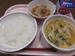 今日の給食は、牛乳・ごはん・豚肉と丸天の煮物・油揚げのみそ汁でした。