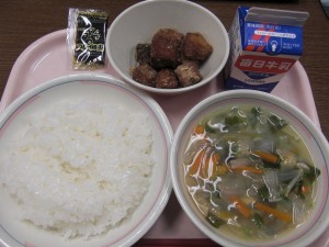 今日の給食は、牛乳、ごはん、のりの佃煮、かつおの竜田揚げ、すまし汁でした。