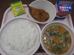 今日の給食は、牛乳・ごはん・野菜ふりかけ・イワシの梅しそフライ・僧兵汁 でした。(和歌山県メニューです。)