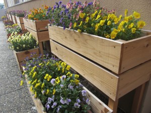 運動場へ行く渡り廊下に、きれいなお花がズラリと並んでいます。