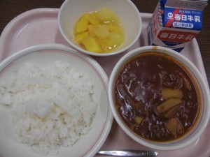 今日の給食は、牛乳・ごはん・ハヤシライスの具・フルーツミックス でした。