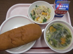 今日の給食は、牛乳・黒糖パン・炒めビーフン・わかめスープ でした。