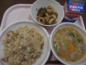 今日の給食は、牛乳・鶏めし・竹輪とこんにゃくの炒り煮・みそ汁 でした。