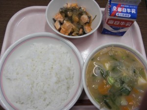 今日の給食は、牛乳・ごはん・鮭の香味ソースかけ・豆腐のみそ汁 でした。
