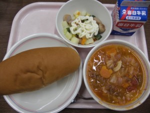 今日の給食は、牛乳・コッペパン・マセドアンサラダ・ミネストローネ でした。