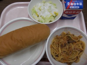 今日の給食は、牛乳・減量コッペパン・スパゲッティトマトソース・キャベツとコーンのサラダ でした。