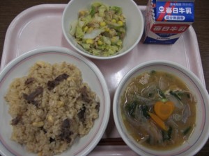 今日の給食は、牛乳・牛肉と大豆のごはん・ツナと野菜の炒め物・豚汁 でした。
