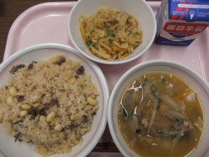 今日の給食は、牛乳・牛肉と大豆のごはん・千切大根の炒め煮・豚汁でした。