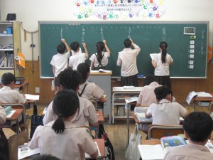 社会科の資料を見て気づいたことを、全員が一つずつ板書しています。