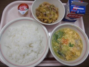 今日の給食は、牛乳・ごはん・キムタクごはんの具・卵とレタスのスープ・リンゴゼリー でした。