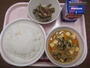 今日の給食は、牛乳・ごはん・豚キムチ豆腐・メヒカリのから揚げ でした。
