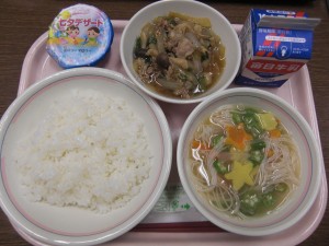 今日の給食は、牛乳・ごはん・豚丼の具・七夕汁・七夕ゼリーと、「七夕メニュー」でした。