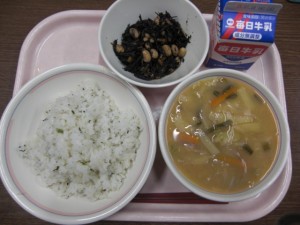 今日の給食は、牛乳・菜めし・大豆とひじきの炒め煮・みそ汁 でした。