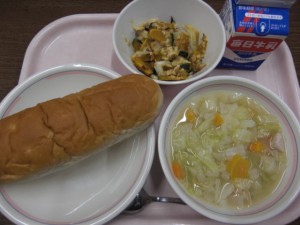 今日の給食は、牛乳・アップルパン・ツナとカボチャのオーブン焼き・キャベツのスープ でした。