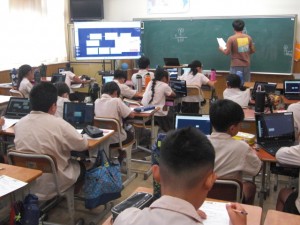 タブレットも活用しながら、三角形の内角について学んでいます。