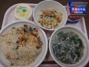 今日の給食は、シシジューシー・ツナとにんじんしりしりのサラダ・もずくスープ・パイナップルゼリー でした。(沖縄メニューです)