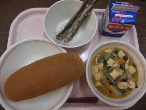 今日の給食は、牛乳・黒糖パン・豚キムチ豆腐・ししゃものから揚げ でした。
