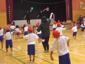 低学年は、ポンポンを片手に先生を見て踊ります。