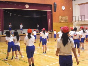高学年は、なんと実行委員さんが舞台からみんなに指導しています。