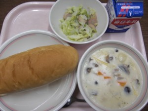 今日の給食は、牛乳・コッペパン・きのこのグラタン風・ソーセージとキャベツのソテー でした。