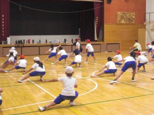 中学年は、4年生が昨年がんばったソーランを、3年生に教えています。