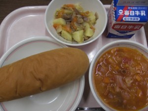 今日の給食は、牛乳・コッペパン・ジャーマンポテト・ミネストローネ でした。