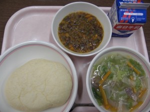 今日の給食は、牛乳・オリーブパン・カレーソース・レタススープ でした。