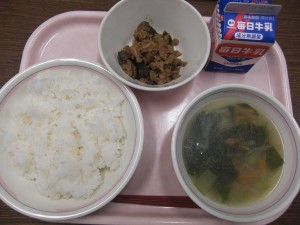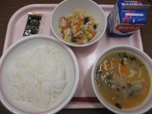 今日の給食は、牛乳・ごはん・のりの佃煮・鮭とキャベツの塩こうじ焼き・油揚げのみそ汁 でした。