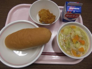 今日の給食は、牛乳・コッペパン・ホキのコーン衣フライ・野菜の洋風煮 でした。