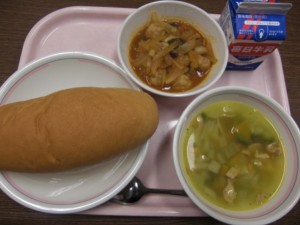 今日の給食は、牛乳・コッペパン・煮込みチキンボール・かぼちゃのコンソメスープ でした。